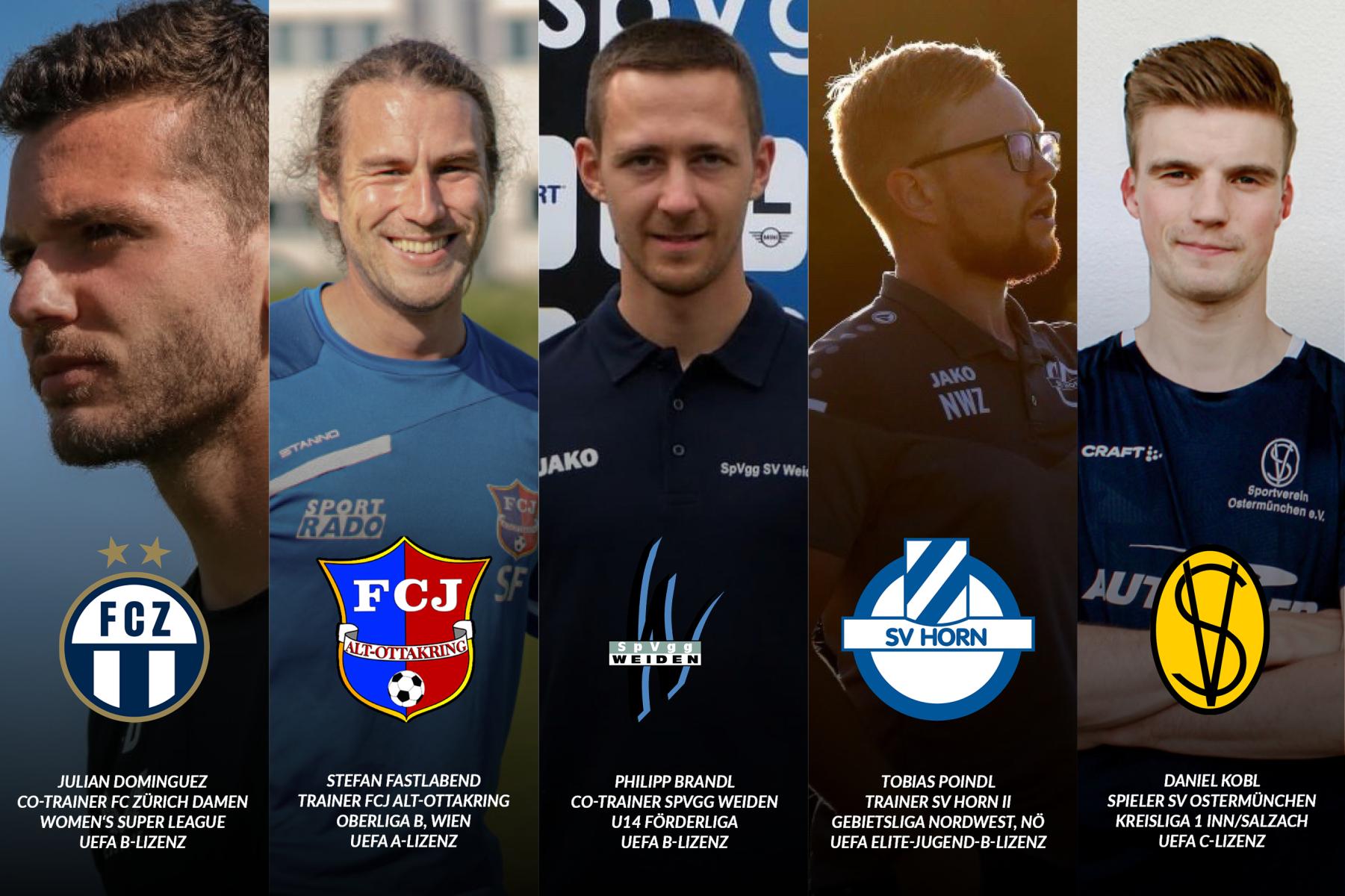 Blant dem finner vi Julian Dominguez, UEFA B-lisensinnehaver og nåværende assistenttrener for FC Zürich kvinner i Women’s Super League, som tidlig fant sin lidenskap som trener etter spillerkarrieren. Stefan «Fasti» Fastlabend er hovedtrener i FCJ Alt-Ottakring og nyutdannet UEFA A-lisensinnehaver. Philipp Brandl har UEFA B-lisens og var sist assistenttrener i U14-utviklingsligaen hos SpVgg SV Weiden. Tobias Poindl er nåværende hovedtrener for SV Horn Amateure og innehar både UEFA Elite Youth B- og UEFA B-lisens. Og Daniel Kobl er aktiv spiller i SV Ostermünchen og fersk UEFA C-lisensinnehaver.